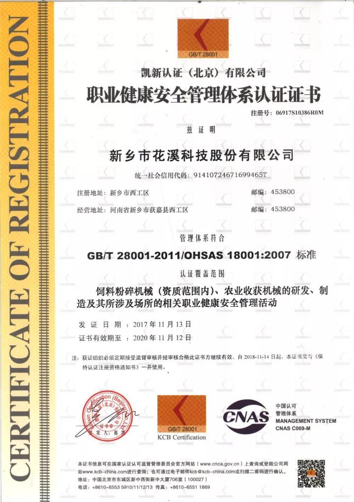 2017年11月13日,花溪公司獲得了環(huán)境管理體系(ISO14001)認證證書和職業(yè)健康安全管理體系(OHSAS18001)認證證書。